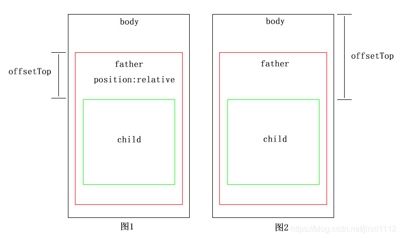 2. offsetParent:距离元素最近的一个具有定位的祖宗元素(relative,absolute,fixed),若祖宗都不符合条件,offsetParent为body。如下图所示:获取child的offsetTop,图1的offsetParent为father,图2的offsetParent为body。
