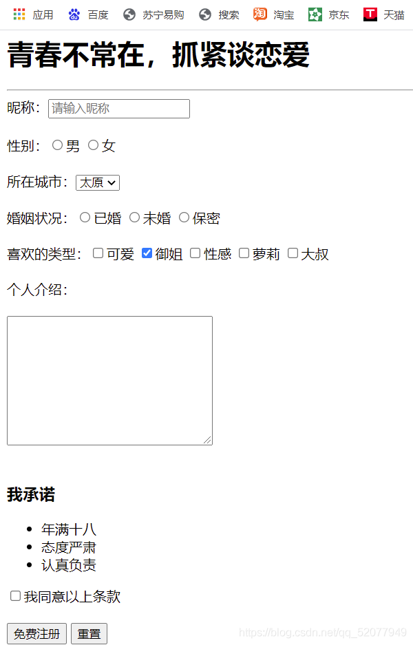 昵称:<input type="text" placeholder="请输入昵称"><br><br>