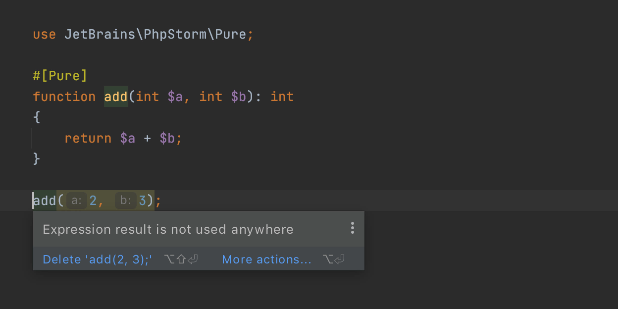 如果该函数被标记为pure函数,但您尝试在函数外部进行更改,即产生副作用,则PhpStorm将警告您并突出显示不安全的代码。