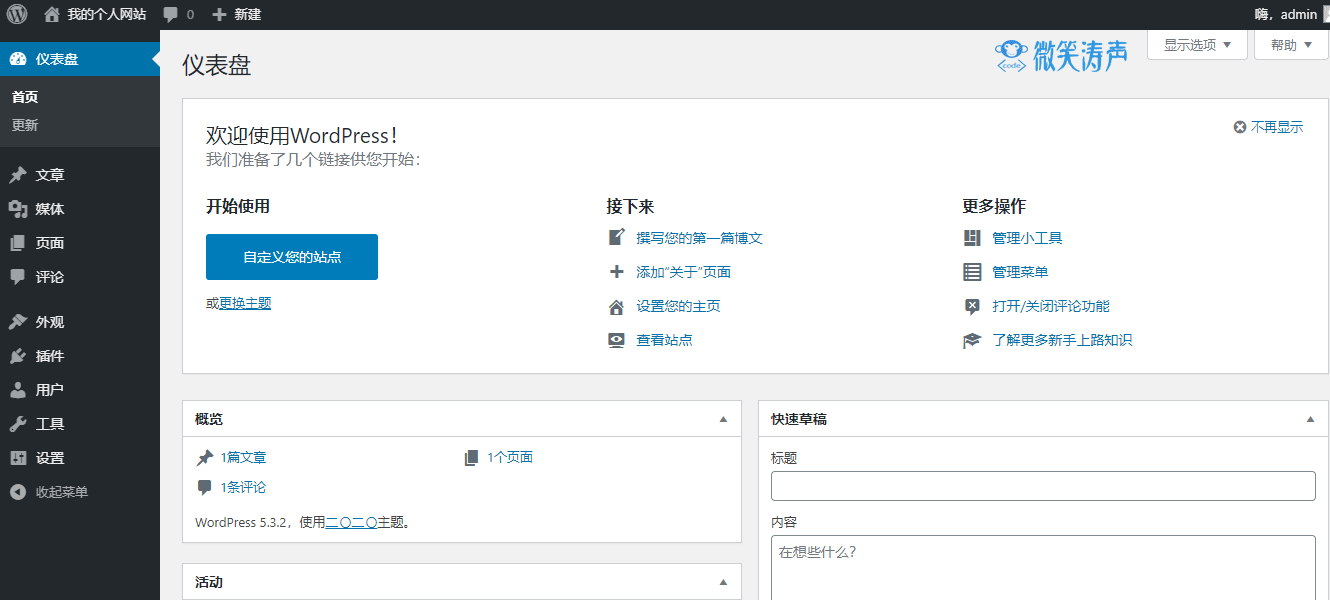13、到此基于WordPress的个人博客已经搭建完成。现在可以对博客进行更多的个性化设置了,让博客变得更加的美观。