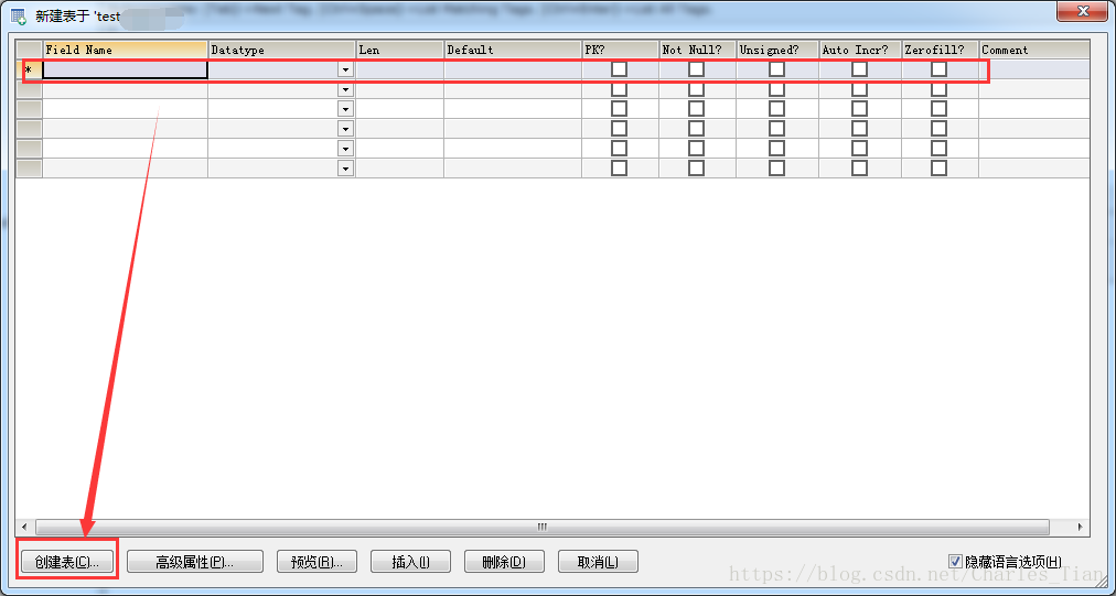 点击创建表之后弹出以下框,随后在表格里填写你想要的字段和这个字段的数据类型和长度大小以及是否为空,默认值为多少等,填写完之后点击左下角的创建表就创建成功了;