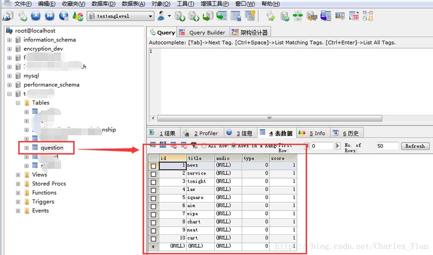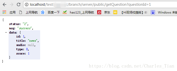 localhost/解压后的文件夹名称/server/public/getQuestion?questionId=1就可以获取到后台返回的数据了。这时会发现,返回的数据跟我们之前在表中填充的数据是一模一样的,那就意味着你写接口是成功的。