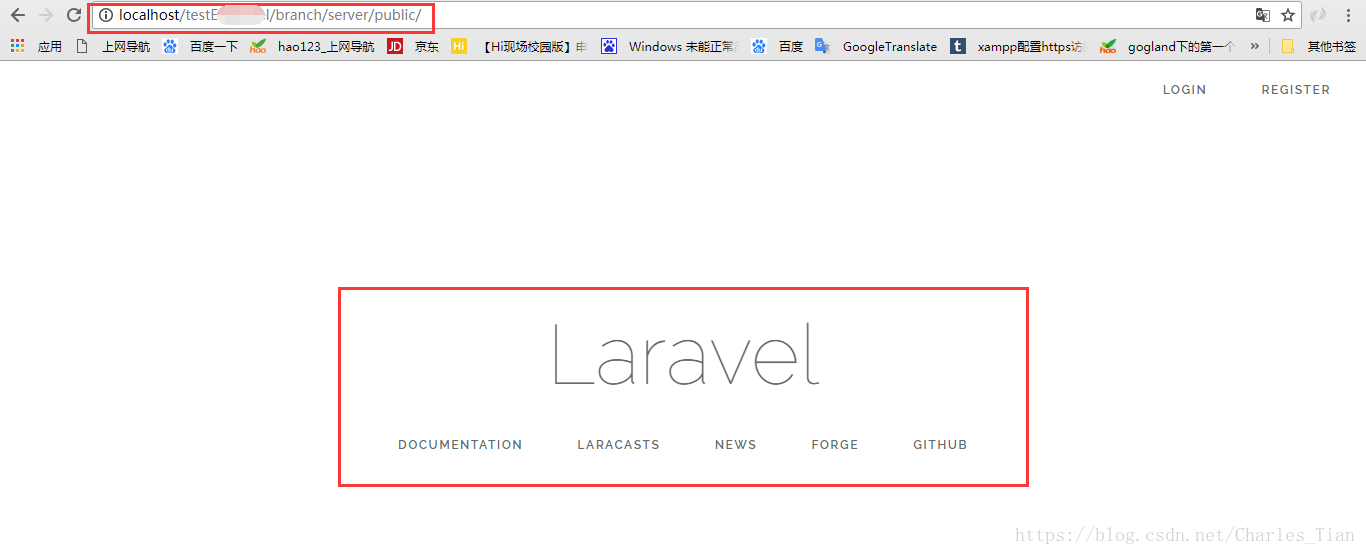 localhost/解压后的文件夹名称/server/public/,然后回车就可看到以下界面(红色框是我的文件路径),出现以下界面说明开发环境搭建成功。