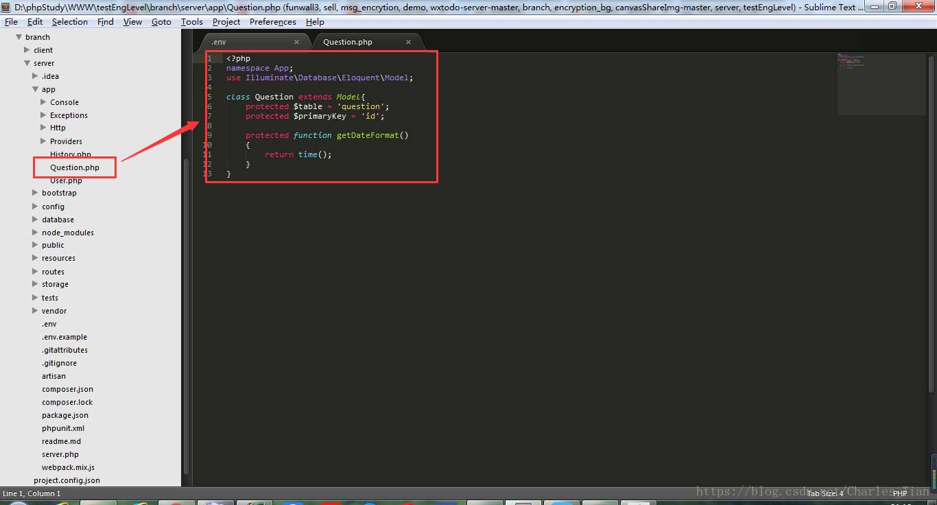 3.连接好数据库之后,在app目录下新建一个Question.php文件,用于访问question数据表;