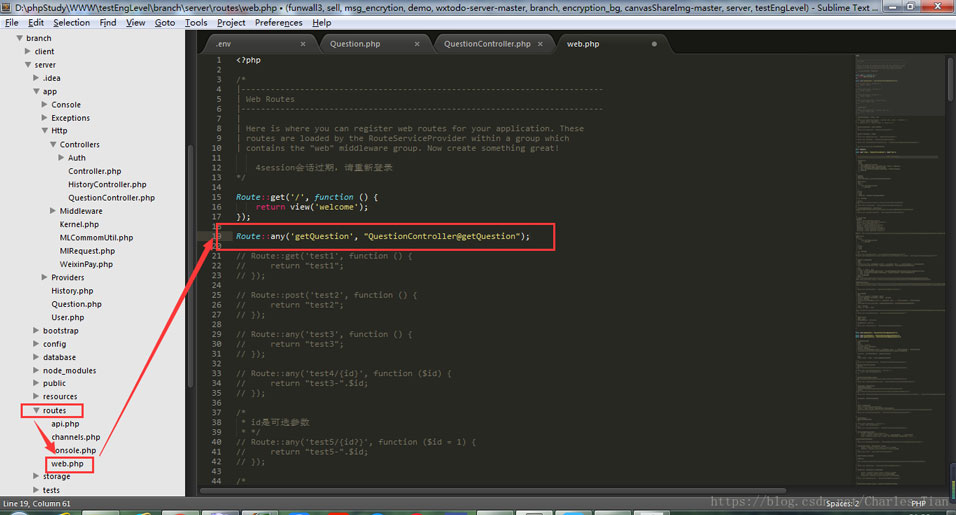 4.开始编写真正意义上的接口了。在app/Http/Controllers目录下新建一个QuestionController.php文件,然后在上面写上: