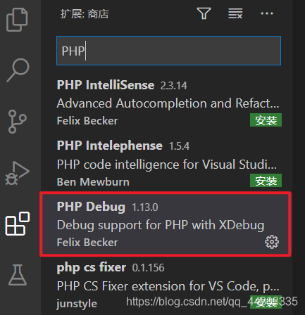 1、点击扩展栏,输入PHP,选择PHP Debug安装。