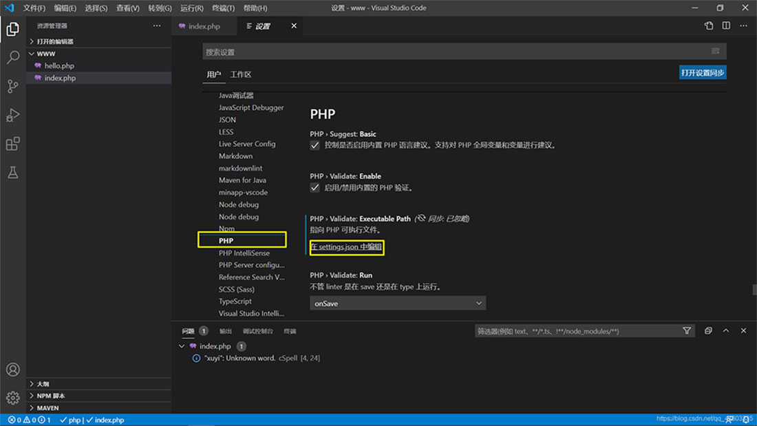 2、点击VSCode的 文件-首选项-设置(不同版本可能显示不同,注意查找用户设置),在设置里面的扩展找到php,点击setting.json添加以下一行配置: