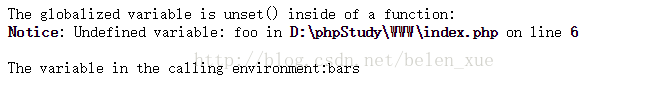 而外部调用环境的$foo仍保留着没有被unset进行销毁,上面官方描述上写了调用环境的$foo将保留的是在使用unset()前的变量值,因此echo出bars,而不是bar。