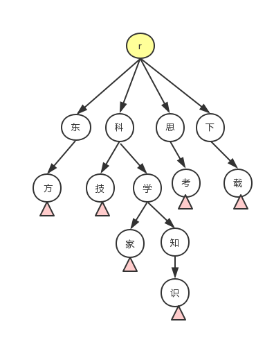 - 从根查询第一个字符这,并没有以这个字符开头的关键词,将字符“指针”向后移,直到找到根下有的字符节点科;