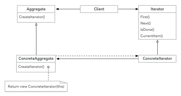 迭代器闪亮登场,主要实现了四个方法来对集合数据进行操作。有点像学习数据结构或数据库时对游标进行的操作。用First()和Next()来移动游标,用CurrentItem()来获得当前游标的数据内容,用IsDone()来确认是否还有下一条数据。所以,这个模式也另称为游标模式。