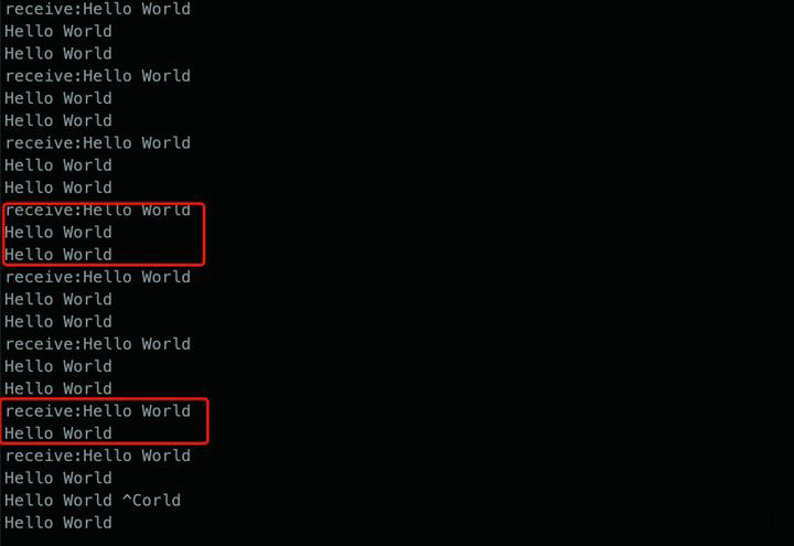 运行结果:可以看到每次接收到一个 Hello World(代码我就不贴了, 只把服务端 set 配置改一下, 其他都一样)