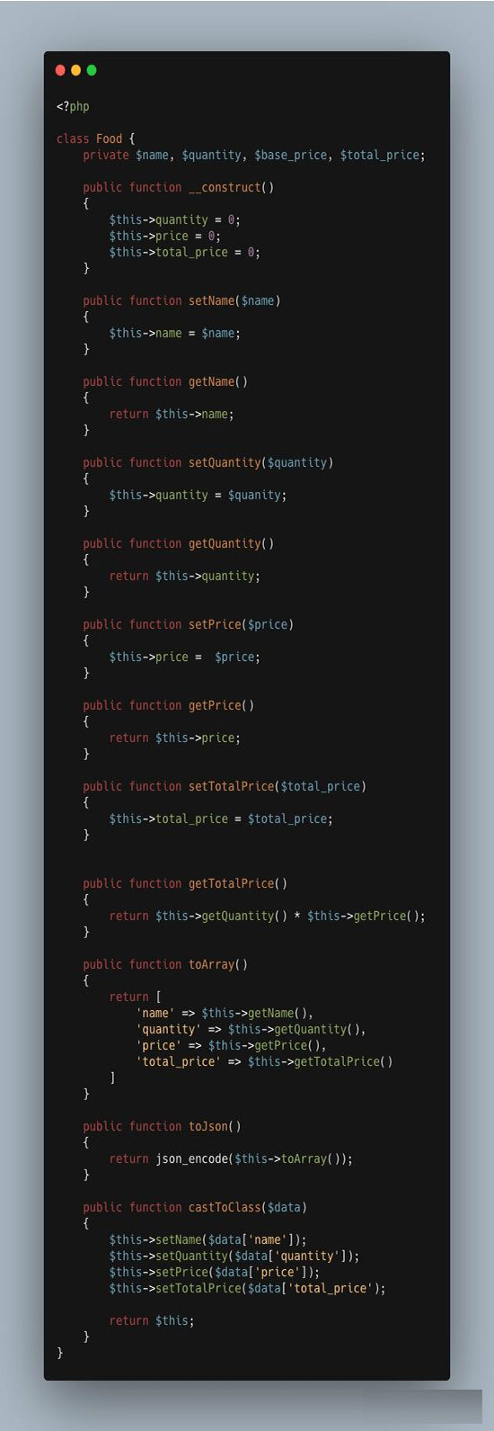你可以通过定义什么类、什么属性来使用 POPO?POPO 应该有 setter 和 getter。首先定义类,食品有属性名、价格、数量和总价。然后我们可以通过食品 POPO 上的 setter 函数来设置值。如果我们想把它转换成 JSON,我们可以调用 “toJSON ()” 函数等。你可以根据自己的需要开发。例如: