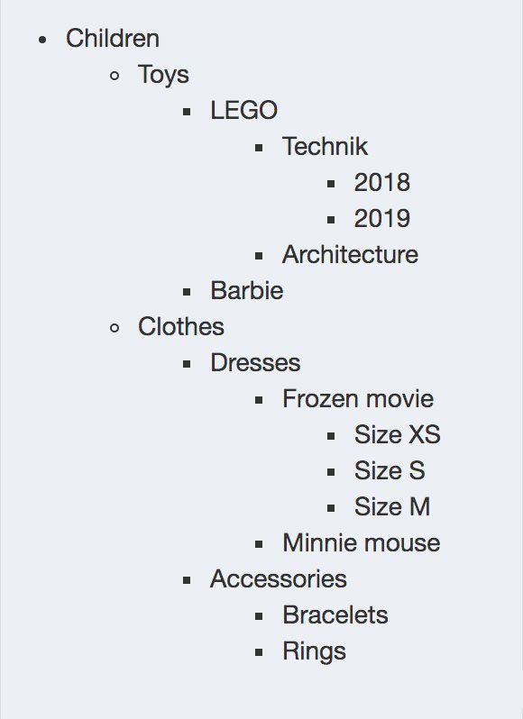 我们会创建一个微型项目来展示儿童商店的分类,总共有 5 级,如下: