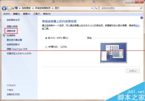 3、点击【显示】选项,进入控制面板显示界面,在左侧菜单栏里可以找的【调整亮度】选项,如下图所示。