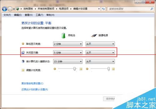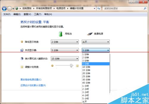 5、点击【选择关闭显示器的时间】选项,进入编辑计划设置界面,在该界面可以看到关闭显示器选项了,笔记本电脑有用电池和接通电源两种方式,如下图所示。