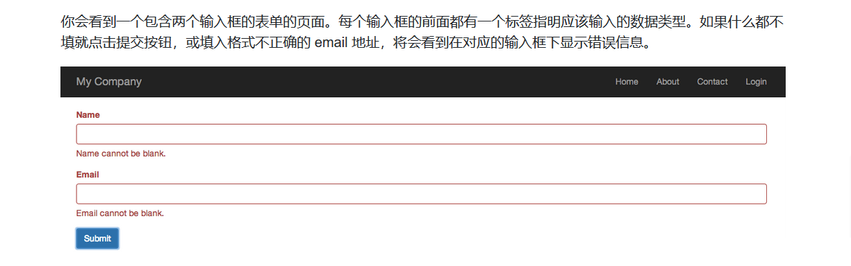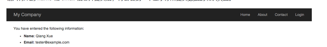用户提交表单后,操作将会渲染一个名为 entry-confirm 的视图去确认用户输入的数据。 如果没填表单就提交,或数据包含错误(译者:如 email 格式不对), entry 视图将会渲染输出,连同表单一起输出的还有验证错误的详细信息。