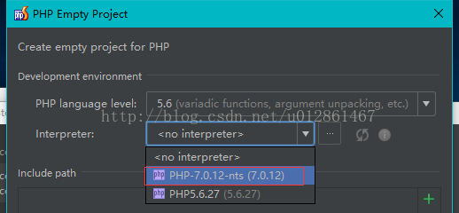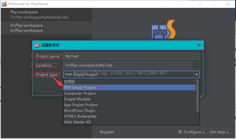 第一步:打开PhpStorm软件,点击创建新项目,在输入框填写项目名称,项目存放地址,项目类型信息。