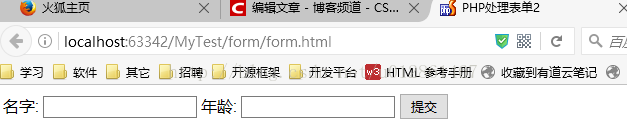 <!DOCTYPE html> <html lang="en"> <head> <meta charset="UTF-8"> <title>PHP处理表单2</title> </head> <body> <form action="welcome.php" method="post"> 名字: <input type="text" name="fname"> 年龄: <input type="text" name="age"> <input type="submit" value="提交"> </form> </body>