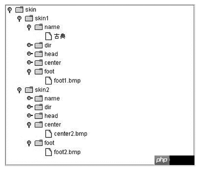 </skin>登录后复制可以看得出来,该XML文档是一个多界面程序的界面图片配置程序,如果将该XML文档可视化,那么使用JTree的话应该得到的是如下图所示的结果。