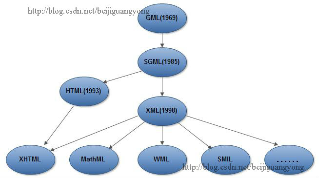 学习知识首先要知道这个知识是如何产生的,是为了解决什么问题产生的,然后才有这个知识怎么运用的问题,所以这个教程的第一篇就来说说XML是怎么来的。XML的发展历史如下图所示,图中部分内容篇幅所限,不深入探讨。