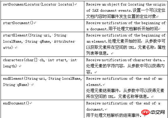 在SAX接口中,事件源是org.xml.sax包中的XMLReader,它通过parser()方法来解析XML文档,并产生事件。事件处理器是org.xml.sax包中ContentHander、DTDHander、ErrorHandler,以及EntityResolver这4个接口。XMLReader通过相应事件处理器注册方法setXXXX()来完成的与ContentHander、DTDHander、ErrorHandler,以及EntityResolver这4个接口的连接。