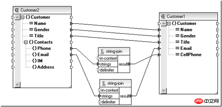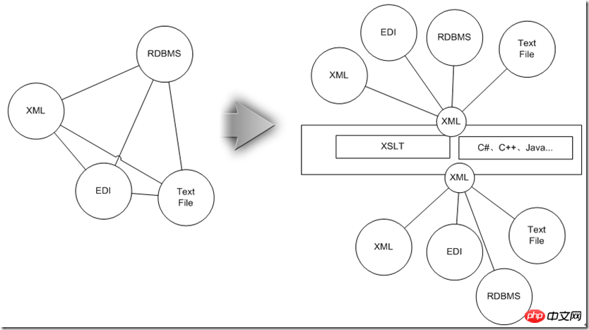 这时候如果为每两种类型都设计一个点对点的适配器,整体规模将沿着N^2级的趋势发展,为此不妨先把他们统一为兼容这些信息的XML,然后用上面介绍的XSLT技术进行数据实体间的映射后,接着把XML再转换成目标数据源所需的形式,这样整个适配体系复杂度降为N级。
