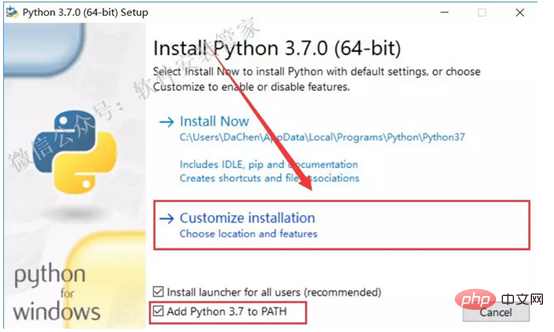 4.勾选【Add Python 3.7 to PATH】,然后点击【Customize installation】。