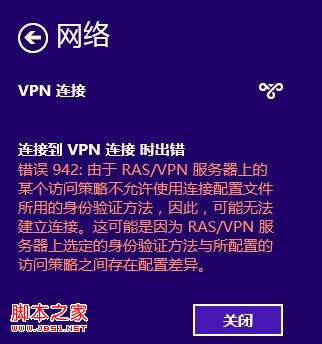 同一个vpn在xp、win7下均可使用,一到win8系统就报942错误,如下图: