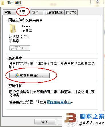 到win7系统盘下有一下"用户"目录(users) 右键-->共享-->高级共享-->点击"共享"选项卡-->高级共享-->