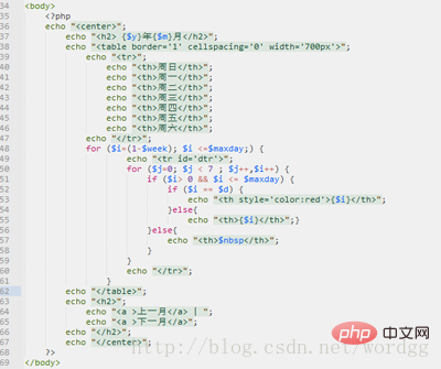 - 以上第一个for循环用于循环输出最大天数,1-$week表示对应的本月第一天是星期几。第二个for循环,循环输出每一行的日期。其中$i == $d表示判断是否为本月本号的日期,如果是则字体为红色标注。