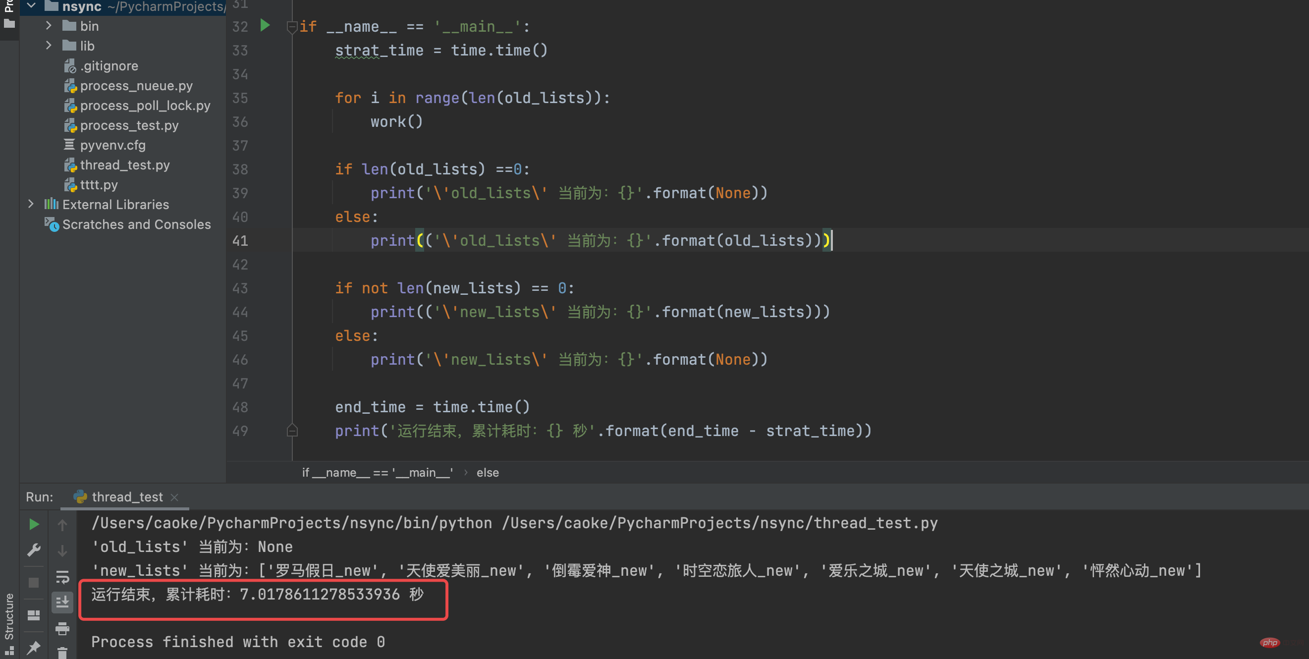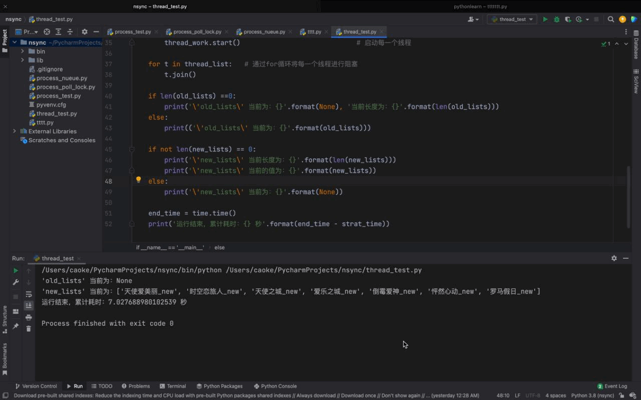 从运行输出结果我们可以看到整个脚本运行共计耗时7秒,而且 new_lists 列表内的元素都经过格式化处理后加上了 _new ;不仅如此, 因为 random模块的choice函数 原因,new_lists 的内容顺序与 old_lists 也是不一样;每次运行顺序都会不一样,所以 old_lists 的顺序是无法得到保障的。