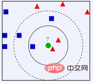 上图中要确定测试样本绿色属于蓝色还是红色。