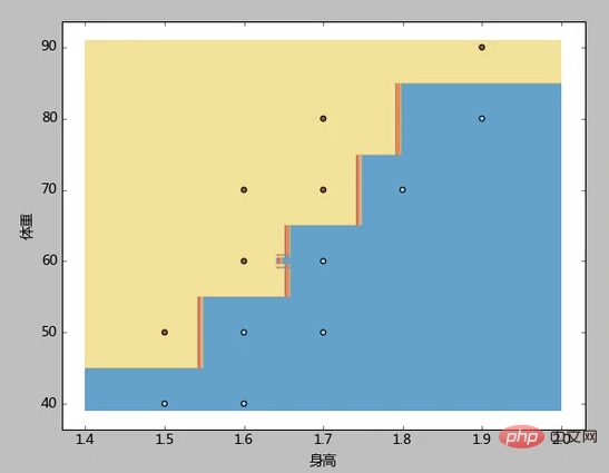 3、本例先根据样本中身高体重的最大最小值,生成了一个密集网格(步长h=0.01),然后将网格中的每一个点都当成测试样本去测试,最后使用contourf函数,使用不同的颜色标注出了胖、廋两类。
