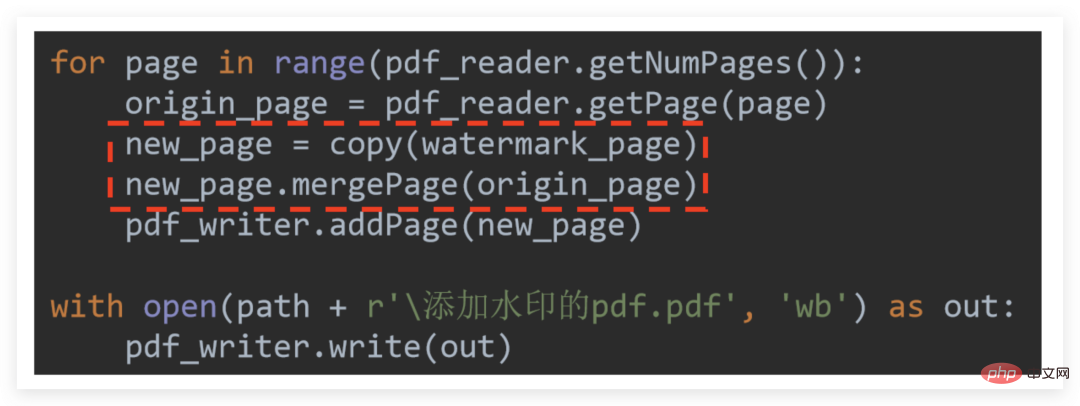 就是把读取器和写入器初始化,并且把水印 PDF 页先读取好备用,核心代码稍微比较难理解: