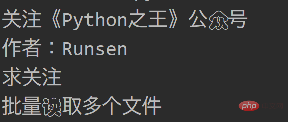 复制代码登录后复制运行后会发现之前写的关注《Python之王》公众号内容修改为作者:Runsen,因为 w模式会清除原文件内容,所以小心使用。只要使用了w,就要一次性写完。