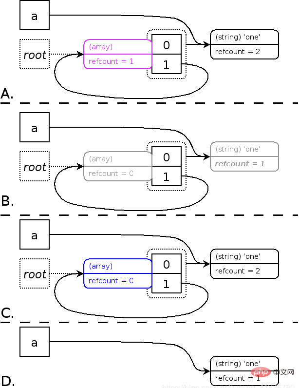 这个算法把所有可能根(possible roots 都是zval变量容器),放在根缓冲区(root buffer)中(用紫色来标记,称为疑似垃圾),这样可以同时确保每个可能的垃圾根(possible garbage root)在缓冲区中只出现一次。仅仅在根缓冲区满了时,才对缓冲区内部所有不同的变量容器执行垃圾回收操作。看上图的步骤 A。