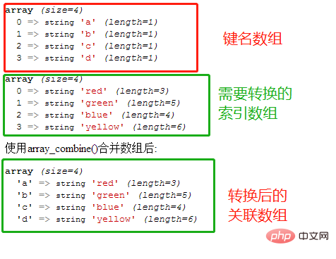 array_combine()函数通过合并两个数组的方式创建了一个新数组,其中$keys数组中的元素作为了新数组的键名,$values数组的元素为作为了新数组的键值。