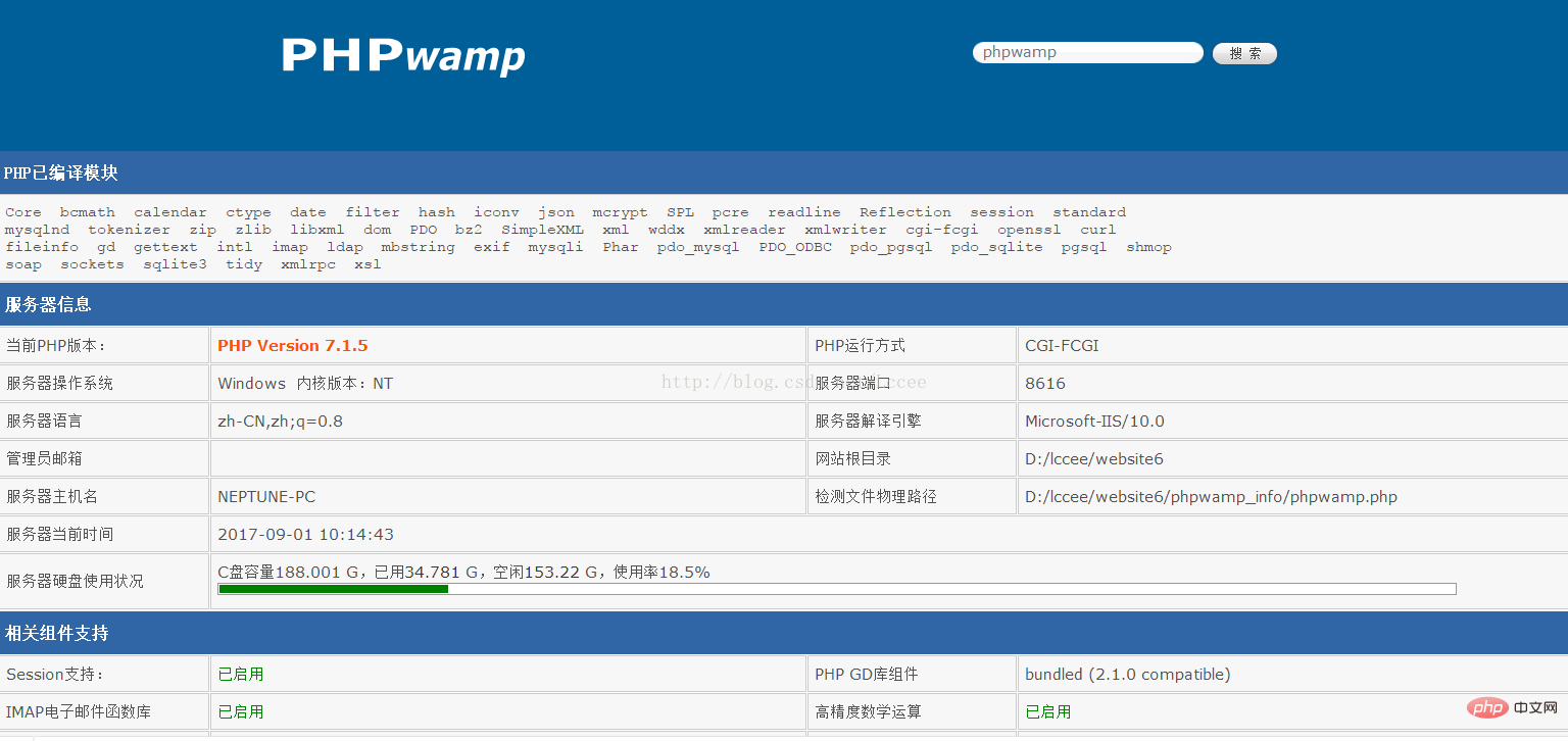 IIS服务器下的PHPWAMP默认环境检测界面效果图