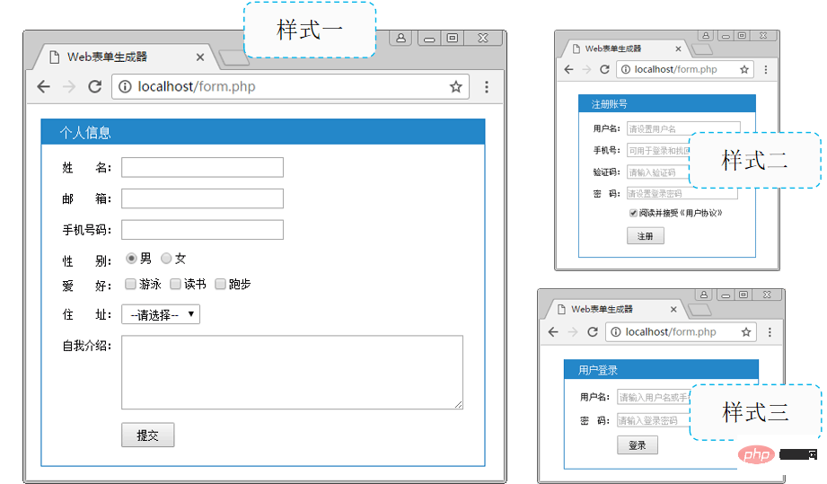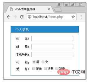 因此,可以利用PHP实现一个Web表单生成器,使其可以根据具体的需求定制不同功能的表单。具体实现需求如下: