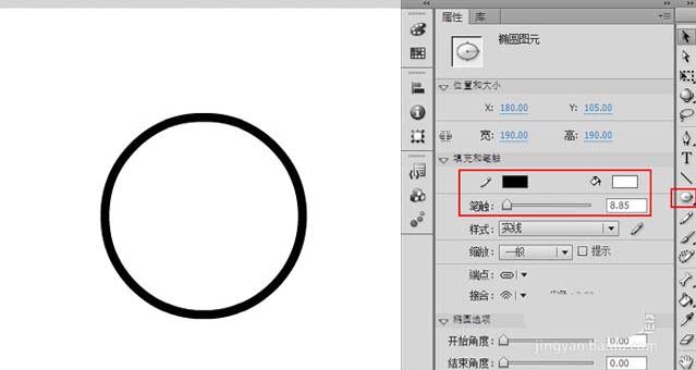 1、新建一个Flash文档,选取工具箱中的【基本椭圆工具】,按Shift键,在舞台上绘制一个圆形头部轮廓。在【属性】面板中设置边缘线为黑色,内部颜色为白色,如图所示。