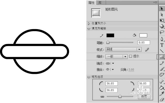2、选取【基本矩形工具】,根据圆形直径绘制耳朵。在【属性】面板中设置基本矩形弧度,如图所示。
