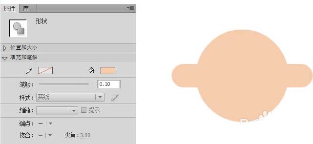 6、选择【颜料桶工具】,在其【属性】面板中设置填充颜色为肉色(F5CCAC),在头像轮廓内单击来填充颜色。在轮廓上双击,将其笔触颜色设为“无”,设置后的场景效果如图所示。