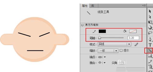 8、新建图层3,选取【线条工具】,设置笔触颜色为黑色,笔触为3.2,在娃娃头像上绘制3条直线作为人物的眼睛和嘴巴,如图所示。
