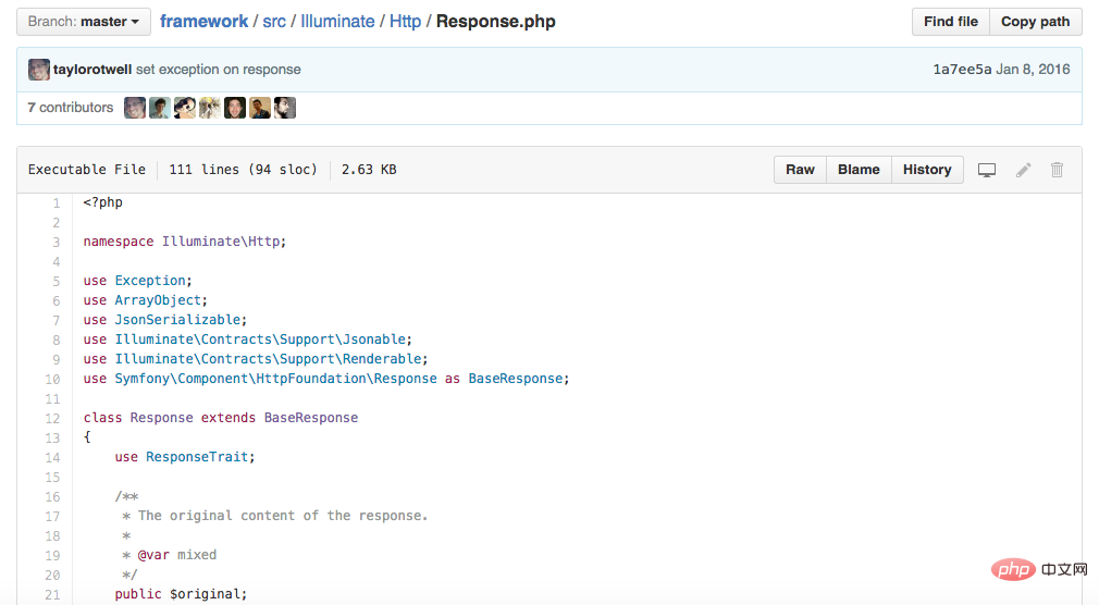 打开这个组件在GitHub中的仓库(https://github.com/laravel/framework/blob/master/src/Illuminate/Http/Response.php),找到Response.php文件: