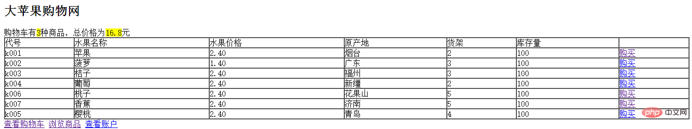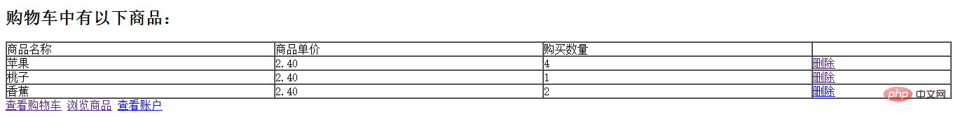 <a href="zhanghu.php" rel="external nofollow" rel="external nofollow" >查看账户</a> </p> 14 15 </body>登录后复制这样进入购物车页面显示如图所示: