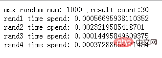 function invoke_entry($func_name) { $time = new time(); $time->time_start(); call_user_func($func_name); echo $func_name.' time spend: ', $time->time_spend(); echo '<br/>';}function rand1() { $numbers = range (1, RANDOM_MAX); shuffle($numbers); //随机打乱数组 $result = array_slice($numbers, 1, COUNT); return $result;}function rand2() { $result = array(); while(count($result)< COUNT) { $result[] = mt_rand(1, RANDOM_MAX); //mt_rand()是比rand()更好更快的随机函数 $result = array_unique($result); //删除数组中重复的元素 } return $result;}function rand3() { $result = array(); while(count($result) < COUNT) { $_tmp = mt_rand(1, RANDOM_MAX); if(!in_array($_tmp, $result)) { //当数组中不存在相同的元素时,才允许插入 $result[] = $_tmp; } } return $result;}function rand4() { $result = array(); while (count($result) < COUNT) { $result[] = mt_rand(1, RANDOM_MAX); $result = array_flip(array_flip($result)); //array_flip将数组的key和value交换 } return $result;}class time { private $_start; public function time_start() { $this->_start = $this->microtime_float(); } public function time_spend() { return $this->microtime_float() - $this->_start; } private function microtime_float() { list($usec, $sec) = explode(" ", microtime()); return ((float)$usec + (float)$sec); }}