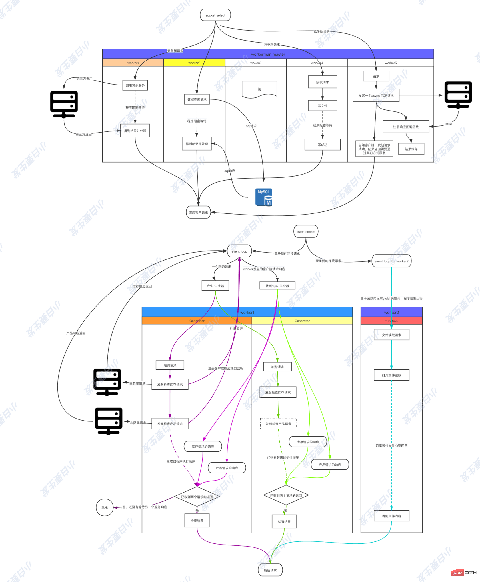 图的上部是Workerman 的工作泳道图,图下部是CoWorkerman的工作泳道图。
