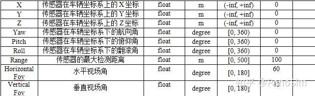 | Z | 传感器在车辆坐标系上的 Z 坐标 | float | m | (-inf, +inf) | 0 | |