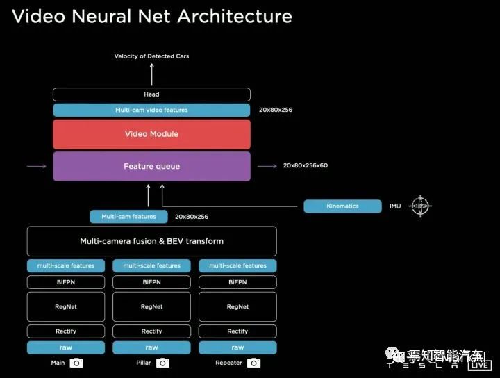 为此,Tesla在网络中又添加了特征队列模块(Feature queue module)用来缓存时序上的一些特征,以及视频模块(Video module)用来融合时序上的信息。此外,还给模型加入了IMU等模块带来的运行学信息比如车速和加速度。